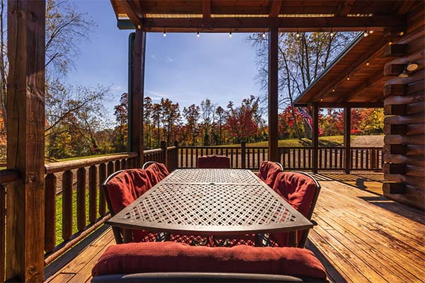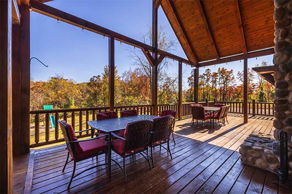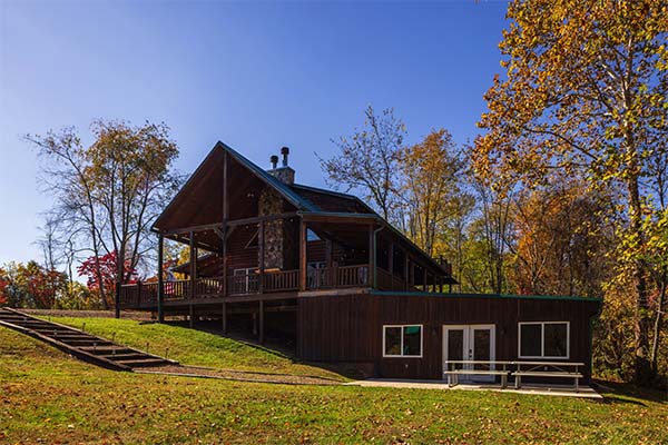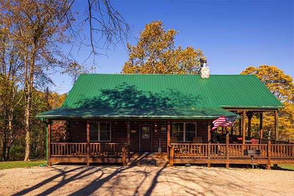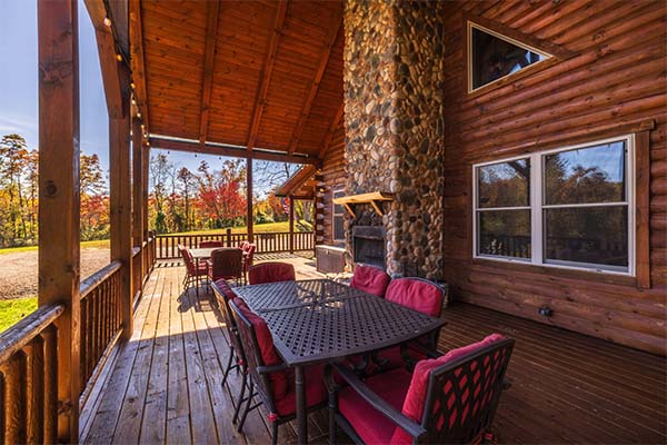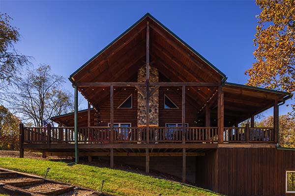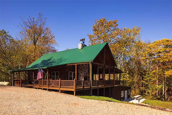 The main level of Green Acres Lodge is wheelchair-friendly. You'll love the cathedral ceiling in the gorgeous great room, which features a stone fireplace, live wood columns, and chef's kitchen complete with granite counter tops, stainless steel appliances, and island with a stone and live edge wood bar. Take some time to relax on the wrap-around covered porch on the main level, complete with outdoor wood-burning stone fireplace, comfortable patio furniture, and a private covered hot tub. You might also enjoy the view from the sleeping loft, an upstairs bedroom balcony, or from the downstairs pool table room or bedroom with access to the lower level deck. The lower level also includes a 60-game arcade cocktail table and flat screen TV for your enjoyment, or sit around the fire ring and tell stories of the day or days gone by.